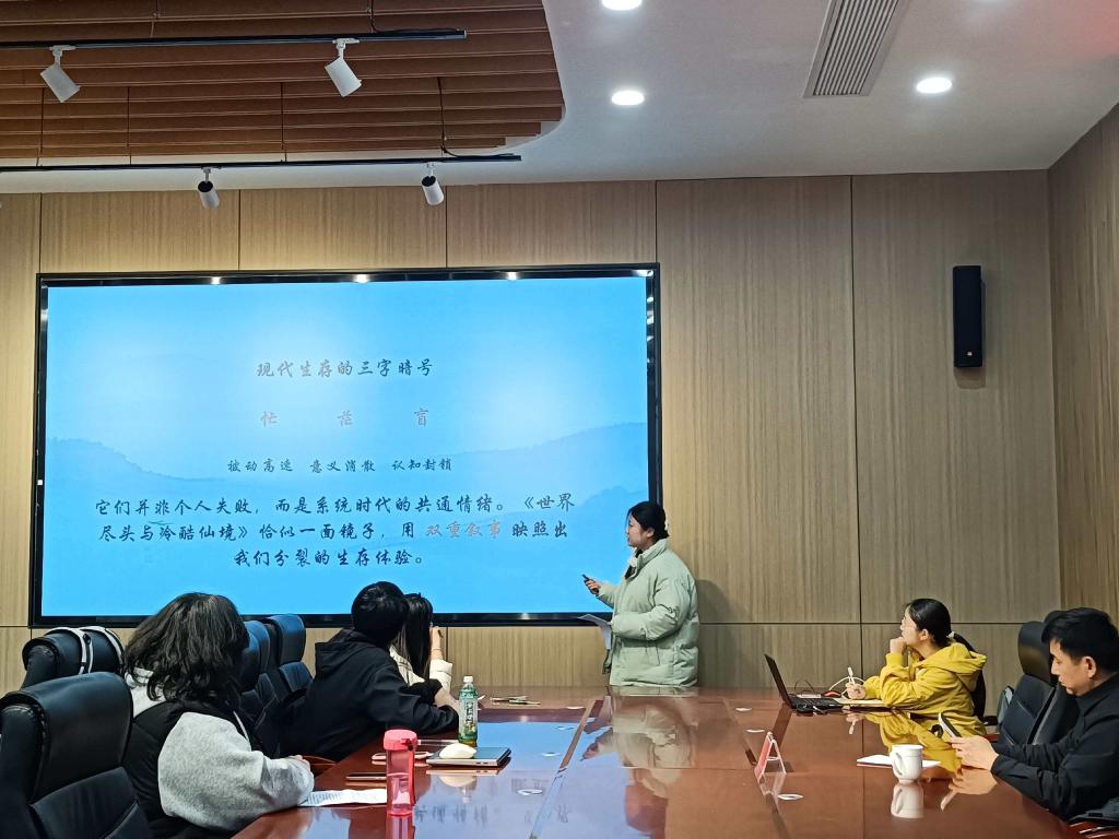 第一位主讲人刘紫璇带来《你当像鸟飞往你的山》,讲述主人公塔拉从被环境禁锢的“盲茫”,到通过教育主动突破、实现自我救赎的历程。她强调,破解困境的核心在于保持学习热情与突破勇气,主动奔赴精神家园。第二位主讲人尹志硕分享《老人与海》,聚焦老渔夫圣地亚哥海上捕鱼的历程。老人的“忙”看似为生计奔波,实则是专注于目标、坚守自我价值的主动奔赴。真正的忙碌应锚定初心,而非在琐事中迷失。第三位主讲人张文亚解析《世界尽头与冷酷仙境》的双重隐喻:“冷酷仙境”的被动忙碌、“世界尽头”的无意义迷茫,直指现代人群的精神困境。她提出,打破“忙茫盲”的关键在于主动自省,通过阅读唤醒自我,寻找精神归属。第四位主讲人张宇彤以《围城》中方鸿渐的人生轨迹为切入点,剖析其在婚恋、求职中的被动忙碌——因缺乏自我认知而盲目跟风,最终陷入茫然。她的分享引发共鸣:唯有认清自我、明确边界,才能跳出世俗“围城”,摆脱无意义内耗。